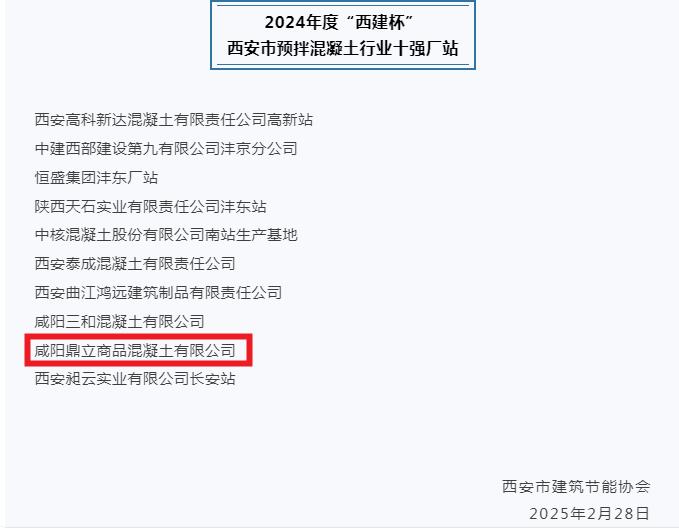由中建西部建設第九有限公司冠名的2024年度“西建杯”西安市預拌混凝土行業十強企業及十強廠站評選活動我公司榮獲2024年度“西建杯” 西安市預拌混凝土行業十強廠站榮譽稱號